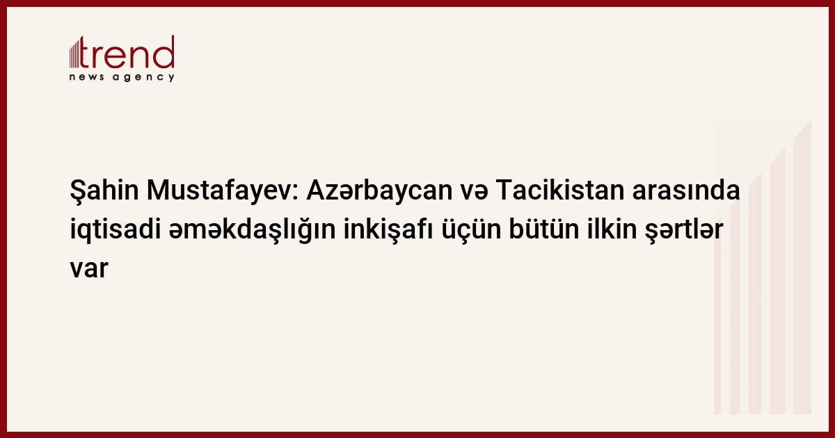 Azərbaycan və Tacikistan arasında iqtisadi əməkdaşlıq sahəsində mövcud uğurlar və nailiyyətlər onların bütün ilkin şərtləri olan inkişaf potensialını kifayət qədər əks etdirmir. Trend-in məlumatına görə, bu barədə Bakıda keçirilən Azərbaycan-Tacikistan ticari-iqtisadi əməkdaşlıq üzrə hökumətlərarası komissiyasının II iclasında Azərbaycanın iqtisadi inkişaf naziri Şahin Mustafayev bildirib.
