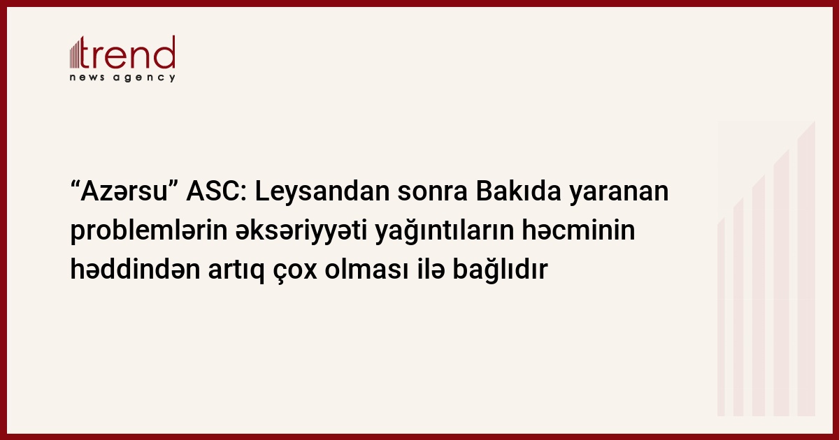 Bakı küçələrində leysandan sonra yaranan problemlərin böyük əksəriyyəti infrasturkurun hazır olmaması ilə deyil, yağıntıların həcminin həddindən artıq çox olması ilə bağlıdır. Bu barədə Trend-ə çərşənbə axşamı "Azərsu" ASC-dən bildirilib.