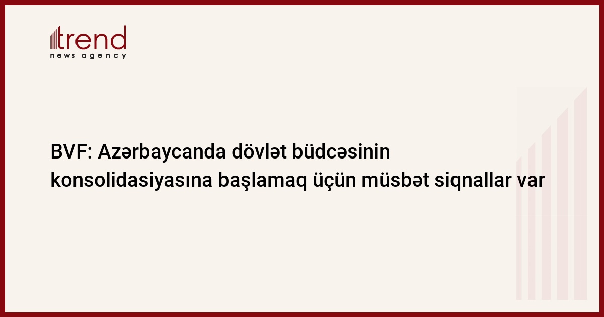Beynəlxalq Valyuta Fondu (BVF) Azərbaycan dövlət büdcəsinin konsolidasiyasına başlamaq üçün müsbət siqnalların olduğunu qeyd edir. Trend-in məlumatına görə, bunu cümə günü mətbuat konfransında BVF-nin Azərbaycandakı missiyasının rəhbəri Raca Almarzoqi deyib.