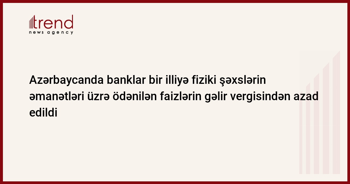 Trend-in məlumatına görə, parlamentin İqtisadi siyasət komitəsinin sədri Ziyad Səmədzadə bildirib ki, qanun banklar və digər kredit təşkilatları tərəfindən fiziki şəxslərin əmanətləri üzrə ödənilən faizlərin 2014-cü il yanvarın 1-dən etibarən 1 il müddətinə gəlir vergisindən azad edilməsini nəzərdə tutur.
