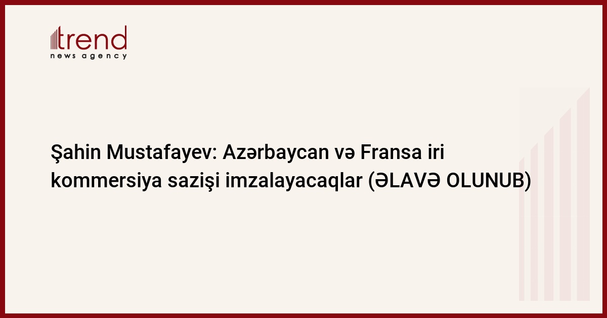 Azərbaycan və Fransa Ticarət-Sənaye Palatası yaradacaqlar. Bu barədə bazar ertəsi Azərbaycan-Fransa biznes forumunu açarkən iqtisadiyyat və sənaye naziri Şahin Mustafayev bildirib.