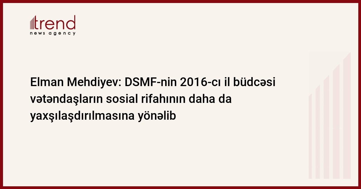 "Azərbaycan Respublikası Prezidentinin müəyyən etdiyi iqtisadi və sosial məsələlərin bir paketdə həll olunması strategiyasının icrası iqtisadi inkişafın ölkə vətəndaşlarının sosial rifahının daha da yaxşılaşdırılmasına yönəldilməsini təmin etməkdədir və Dövlət Sosial Müdafiə Fondunun 2016-cı il büdcəsi layihəsinin təklif olunan varianta qəbulu bu siyasətin reallaşmasına tövhə verəcək". Trend-in məlumatına görə, bunu Azərbaycan Milli Məclisinin növbəti plenar iclasında Azərbaycan Respublikası Dövlət Sosial Müdafiə Fondunun 2016-cı il büdcəsi layihəsinin müzakirəsi zamanı Fondun sədri Elman Mehdiyev öz çıxışında diqqətə çatdırıb.