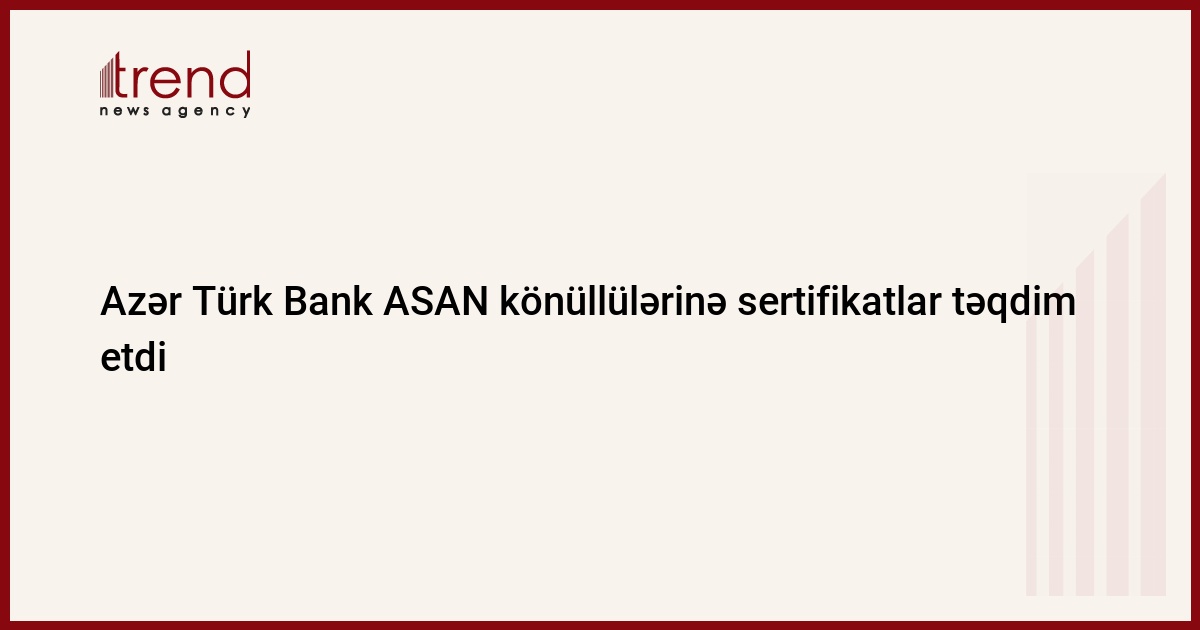 Azər Türk Bank və Azərbaycan Respublikasının Prezidenti yanında Vətəndaşlara Xidmət və Sosial İnnovasiyalar üzrə Dövlət Agentliyinin birgə təşkilatçılığı ilə ASAN könüllüləri üçün bankçılıq sahəsində təşkil olunmuş 1 aylıq təlimlərdə iştirak etmiş könüllülərə sertifikatlar təqdim olunub.