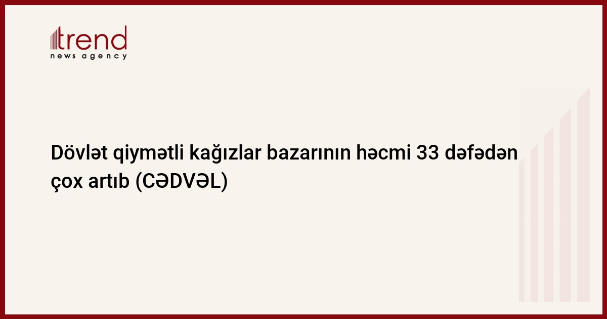 Dövlət qiymətli kağızlar bazarının həcmi 685,12 milyon manat (il ərzində artım 33,4 dəfə), korporativ kağızlar bazarının dövriyyəsi - 398,17 milyon manat (5,4 dəfə azalma), törəmə alətlər bazarının həcmi isə 4,13 milyard manat (31,7 faiz azalma) olub.