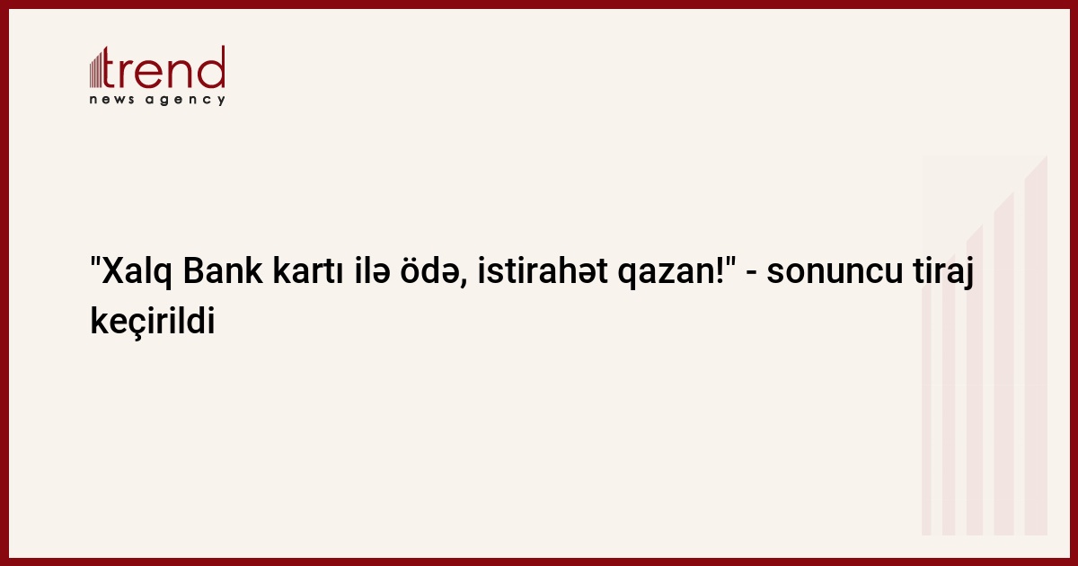 “Xalq Bank kartı ilə ödə, istirahət qazan!” lotereyası cari ilin mart ayının 2-dən başlayaraq 31 dekabr tarixədək davam edib. Lotereya 10 tirajdan ibarət olmaqla 30 şanslı qalibə “İstirahət turu” kuponu qazandırıb. Hər iştirakçı oynanılan mükafat növündən yalnız bir ədəd qazana biliblər. Lotereyada Azərbaycan vətəndaşları ilə yanaşı, xarici vətəndaşlar da iştirak edib.