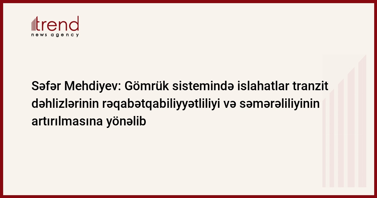 “Gömrük sistemində islahatlar 2019-cu ildə də davam edəcək və bu islahatlar Azərbaycan ərazisindən keçən tranzit dəhlizlərinin rəqabətqabiliyyətliliyi və səmərəliliyinin artırılmasına yönələcək”.