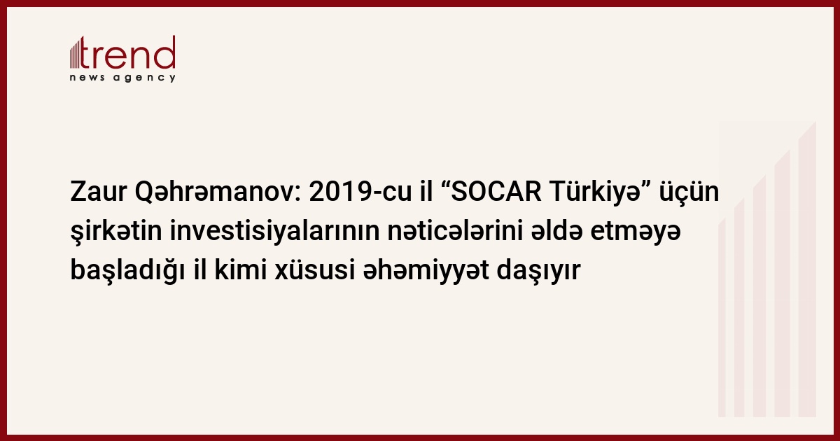 Z.Qəhrəmanov bildirib ki, 2019-cu il “SOCAR Türkiyə” üçün şirkətin qoyduğu investisiyalarının nəticələrini əldə etməyə başladığı il kimi xüsusi əhəmiyyət daşıyır.