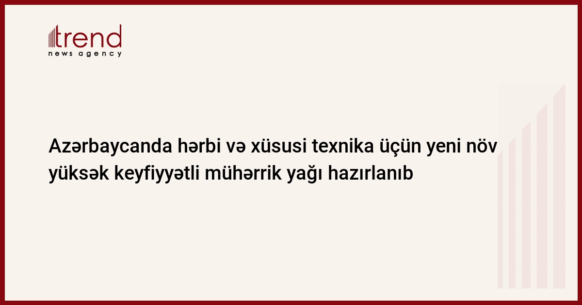 Azərbaycan Milli Elmlər Akademiyasının Yüksək Texnologiyalar Parkında xüsusi təyinatlı dizel mühərrikləri üçün yüksək keyfiyyətli mühərrik yağı sınaqdan keçirilib.