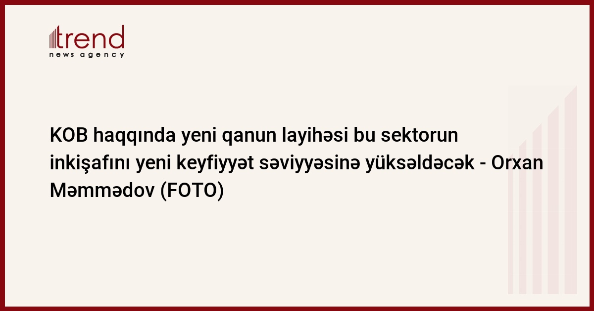“Mikro, kiçik və orta sahibkarlığın inkişafı haqqında” yeni qanun layihəsi KOB sektorunun inkişafının və dövlətin dəstək tədbirlərinin yeni keyfiyyət səviyyəsinə yüksəldilməsinə xidmət edəcək.