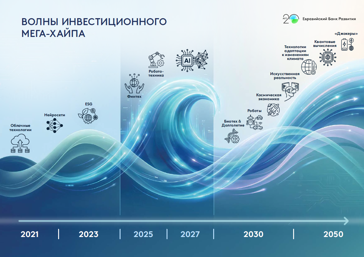 AAİB analitikləri yaxın 20 il üçün iri investisiyalar baxımından yeddi ən çox ehtimal olunan istiqaməti qeyd edirlər: biotexnologiyalar və uzunömürlülük, robotlar və avtonom sistemlər, kvant hesablamaları, virtual reallıq, enerji saxlanması və şəbəkələr, iqlim texnologiyaları və kosmik iqtisadiyyat. Müəlliflərin qiymətləndirməsinə görə, daha yaxın perspektivdə yeni dalğanın ən güclü namizədləri məhz biotexnologiya, robototexnika və virtual reallıqdır.