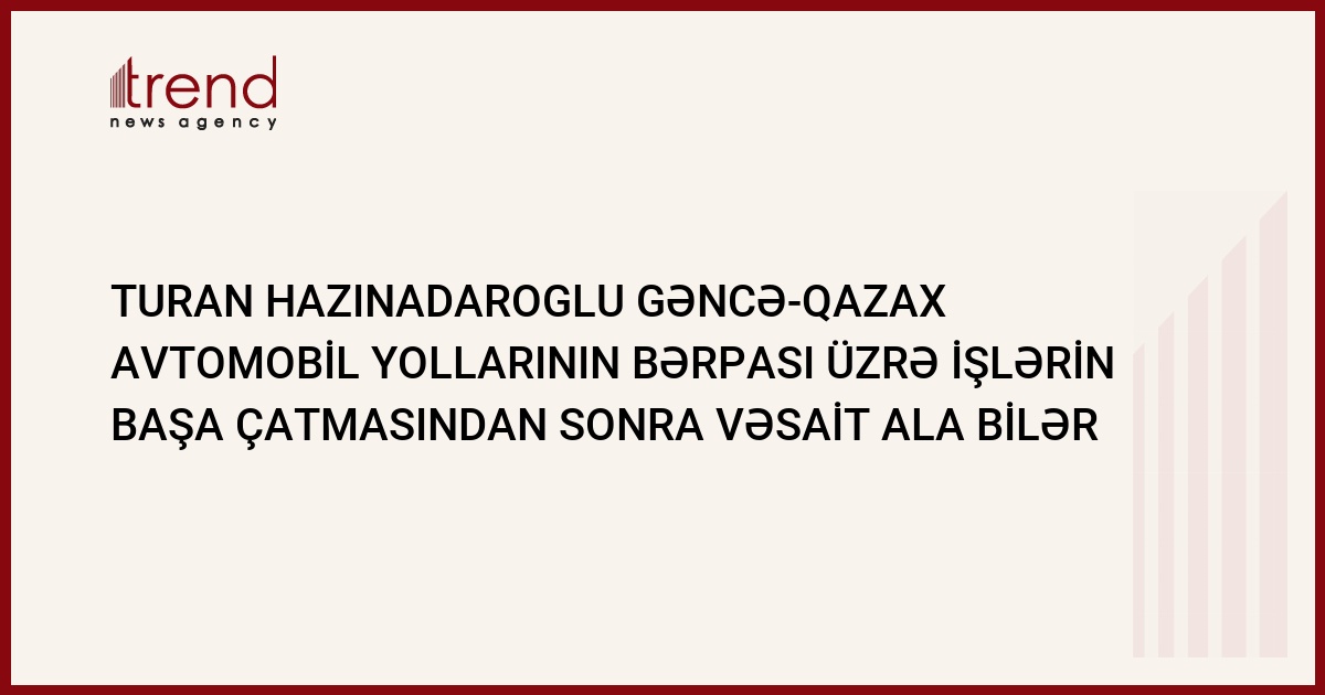 Gəncə-Qazax avtomobil magistralının tikintisinin podratçısı TuranHazinadarogluNəqliyyat Nazirliyində saxlanılan vəsaiti yollarda bərpa işlərinin başa çatmasından sonra ala bilər. Bu barədə jurnalistlərə iyunun 23-də nəqliyyat nazirinin müavini Musa Pənahov məlumat verib.