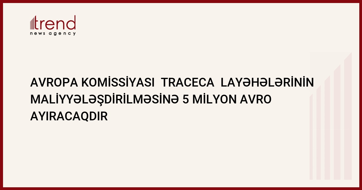 "Avropa Komissiyası Avropa-Qafqaz-Asiya nəqliyyat dəhlizi (TRACECA) layihəsi çərçivəsində sentyabr-oktyar aylarında həyata keçiriləcək layihələrə 5 milyon avro ayırmışdır". Bu haqda TRACECA Hökumətlərarası Daimi Komissiyasında Azərbaycandan olan milli katib Akif Mustafayev Trend ə müsahibəsində bildirmişdir. Onun sözlərinə görə, həmin maliyyə vəsaiti çərçivəsində 3 treninq layihəsinin həyata keçirilməsi planlaşdırılmışdır.