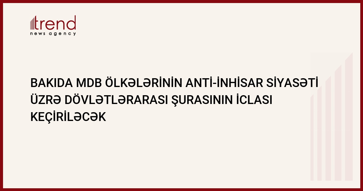 MDB ölkələrinin Anti-inhisar siyasəti üzrə dövlətlərarası şurasının növbəti iclası Bakıda keçiriləcək. AR İqtisadi İnkişaf Nazirliyinin Anti-inhisar siyasəti üzrə departamentinin rəhbəri Rəhim Hüseynovun Trend ə verdiyi məlumata əsasən, tədbir sentyabrın son ongünlüyünə planlaşdırılır.