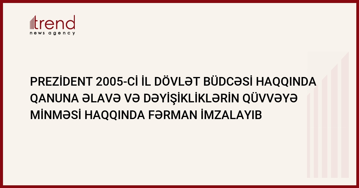Azərbaycan prezidenti İlham Əliyev 2005-ci il üzrə AR dövlət büdcəsi haqqında qanuna əlavə və dəyişikliklərin qüvvəyə minməsi haqqında fərman imzalayıb. Trend agentliyinin məlumatına əsasən, əlavə və dəyişikliklər Milli Məclis tərəfindən 2005-ci ilin iyununda qəbul olunub.