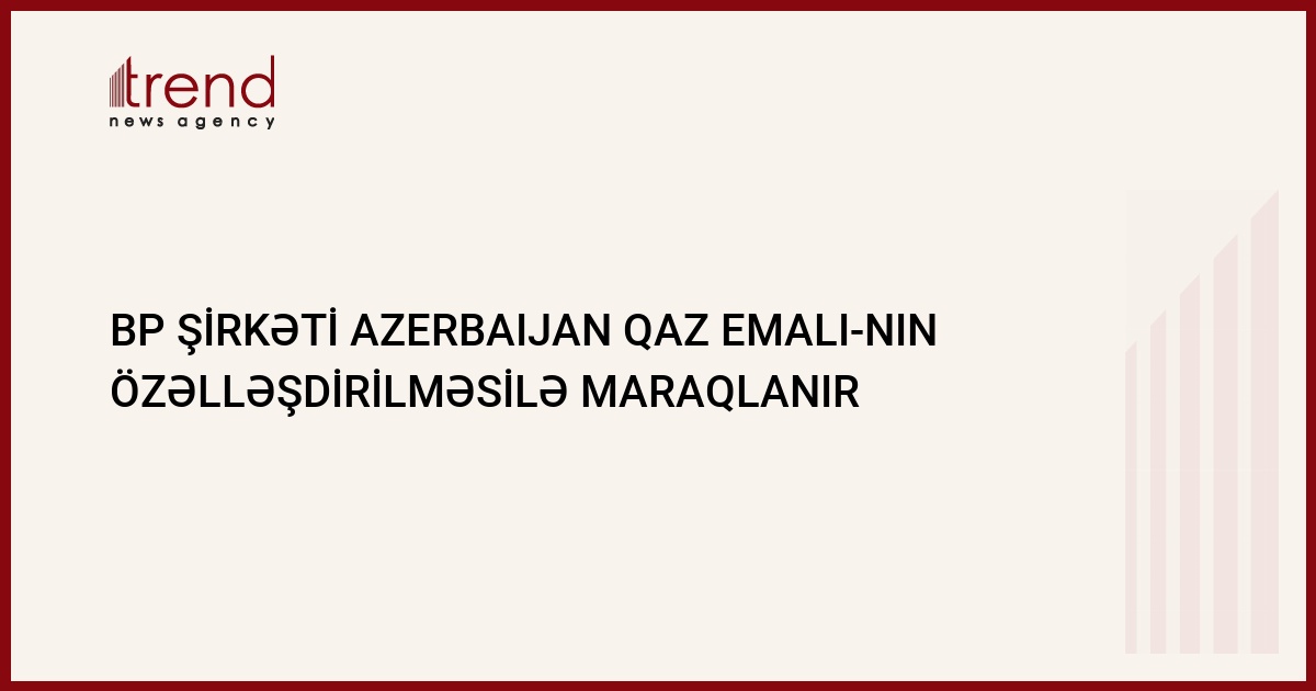 BP şirkəti Azerbaijan Qaz Emali (Azərbaycan qaz emalı zavodu) Səhmdar Cəmiyyətinin özəlləşdirilməsilə maraqlanır. Bu barədə Trend məlumatlı mənbələrə istinadən xəbər yayıb.