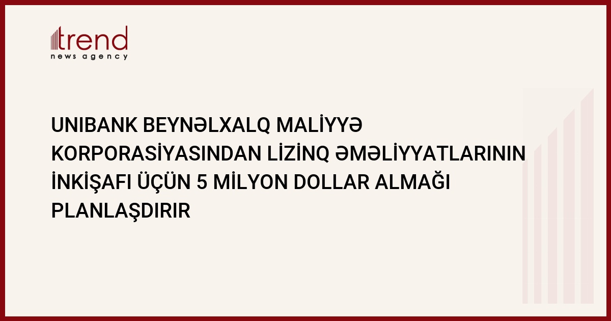 UniBank Beynəlxalq Maliyə Korporasiyasından (BMK) 5 milyon dollar maliyyə vəsaiti almaq niyyətindədir. Bankdan Trend ə verilən məlumata görə, bu vəsait lizinq əməliyyatlarının inkişafı üçün istifadə edilməsi planlaşdırılır.