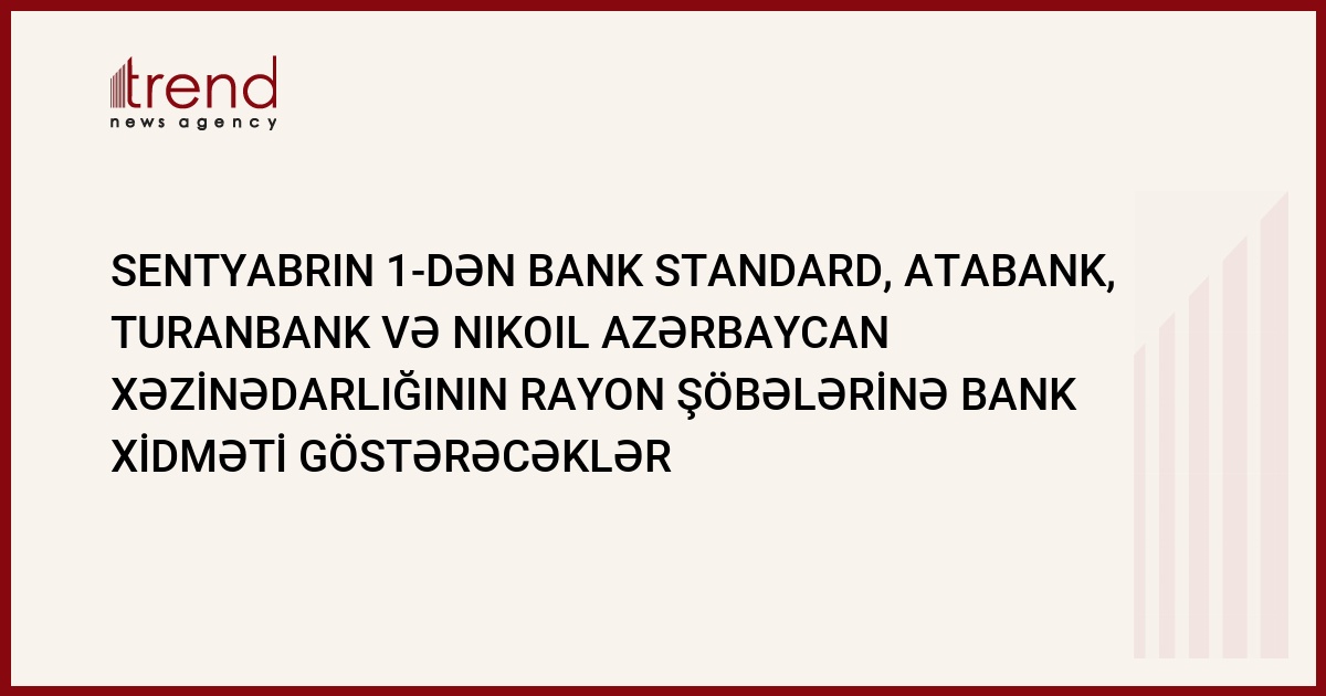 Azərbaycanın Baş Dövlət Xəzinədarlığı maliyyə orqanlarına tranzit xəzinə hesabları xidməti göstərmək üçün 4 kommersiya bankı ilə müqavilə bağlayıb. Xəzinədarlığın direktoru, maliyyə nazirinin müavini Heydər Əsədovun Trend ə verdiyi məlumata görə, Lənkəran rayonunda bu cür xidmət göstərmək üçün müqavilə Bank Standard-la, Xaçmazda AtaBank-la, Qubadlıda (Sumqayıtda yerləşir) Turanbank-la, Qəbələdə investisiya-maliyyə bankı NIKOIL-la bağlanıb. "Xidmətlərin göstərilməsi sentyabrın 1-dən başlanacaq ", -deyə H.Əsədov bildirib.