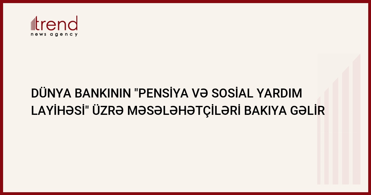 Sentyabrın 15-də Dünya Bankının "Pensiya və sosial yardım layihəsi" (PSAP) üzrə məsləhətçiləri Bakıya gələcək. Trend in məlumatına görə, bu barədə Dövlət Sosial Müdafiə Fondunun (DSMF) rəhbəri Səlim Müslümov avqustun 26-da keçirdiyi mətbuat konfransında məlumat verib.