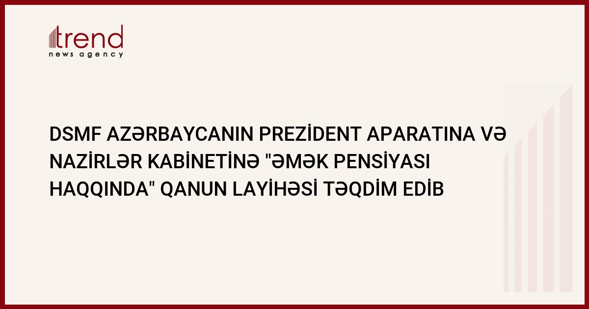 Dövlət Sosial Müdafiə Fondu (DSMF) avqustun 25-də Azərbaycan prezidentinin İcra Aapartına və Nazirlər Kabinetinə "Əmək pensiyası haqqında" qanun layihəsi təqdim edib. Bu barədə Trend ə Fondun rəhbəri Səlim Müslümov məlumat verib.