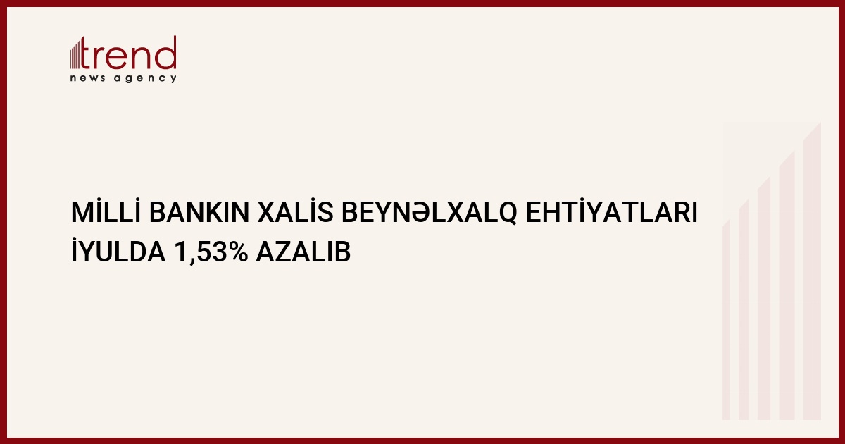 İyul ərzində Azərbaycan Milli bankının xalis beynəlxalq ehtiyatları 1,53% azalıb, ilin əvvəlində isə 12,59% artım müşahidə edilib. Milli bankdan Trend ə bildirildiyi kimi, 2005-ci il avqustun 1-nə XBE 5404,5 mlrd manat olub, bu göstərici 2005-ci il iyulun 1-nə 4800,2 mlrd manat, yanvarın 1-nə 4800,2 mlrd manat təşkil edib.