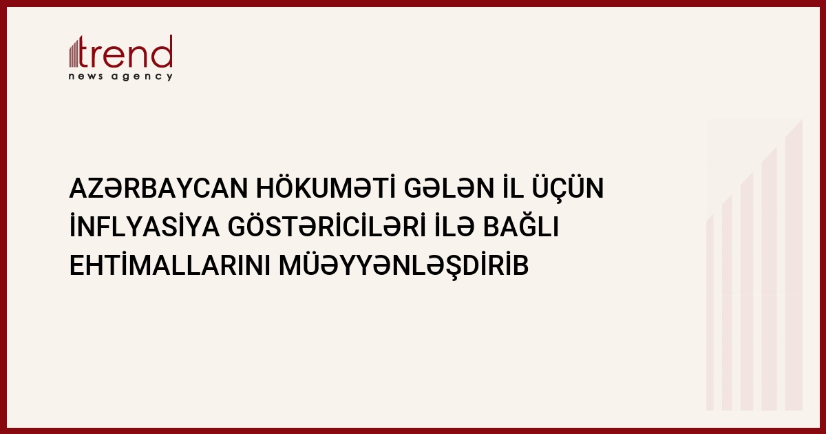 Azərbaycan hökuməti gələn il üçün inflyasiya göstəriciləri üzrə öz ehtimallarını müəyyənləşdirib. Trend in verdiyi məlumatda bildirilir ki, Azərbaycanın maliyyə naziri Əvəz Ələkbərovun sözlərinə görə, 2006-cı il üçün inflyasiyanın proqnoz göstəricilərinin səviyyəsi 9 %-dən yuxarı olmayacaq.