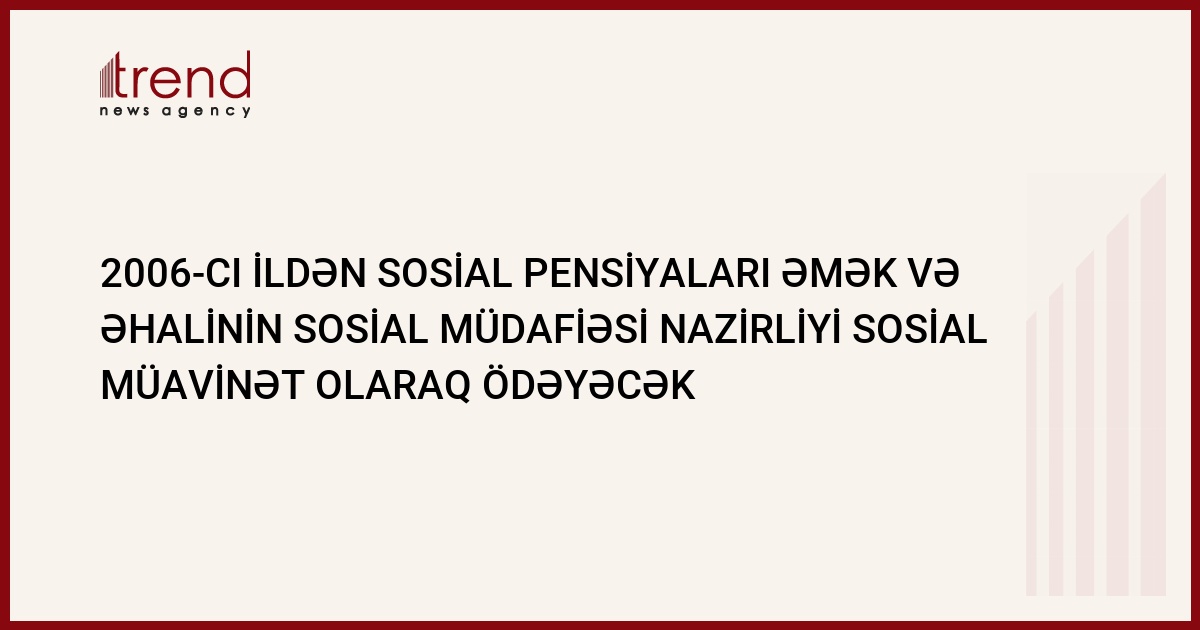 2006-cı ildən sosial pensiyaları əmək və əhalinin sosial müdafiəsi nazirliyi sosial müavinət olaraq ödəyəcək.Əmək və əhalinin sosial müdafiəsi naziri Əli Nağıyev Trend ə bildirib ki, bununla bağlı olaraq büdcədən 200 mlrd. manat veriləcək.