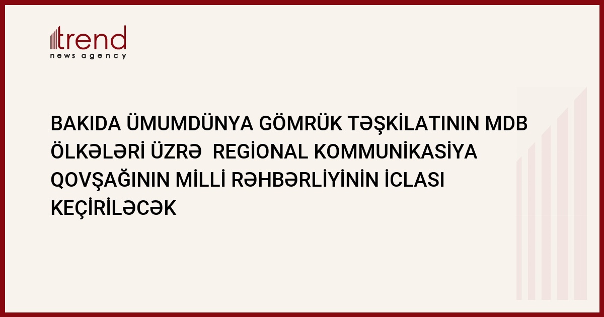 Bakıda Ümumdünya Gömrük Təhşkilatının (ÜGT) MDB ölkələri üzrə regional kommunikasiya qovşağının milli rəhbərliyinin II iclası keçiriləcək. Azərbaycanın Dövlət Gömrük Komitəsindən (DGK) Trend ə verilən məlumata görə, tədbir sentyabrın 14-15-də DGK regional tədris mərkəzində keçiriləcək.