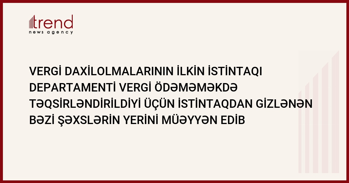 Vergilər nazirliyinin vergi daxilolmalarının ilkin istintaqı Departamenti vergiləri ödəməməkdə təqsirləndirildiyi üçün istintaqdan gizlənən bəzi şəxslərin olduğu yeri müəyyən edib və onların saxlanılması üçün əməliyat-axtarış tədbirlərini gücləndirib. Nazirlikdə Trend ə bildirilib ki, bu şəxslər barəsində ilin əvvəlindən sentyabrın 20-dək axtarış elan edilib.Bununla 42 nəfər tapılıb və istintaqa verilib.