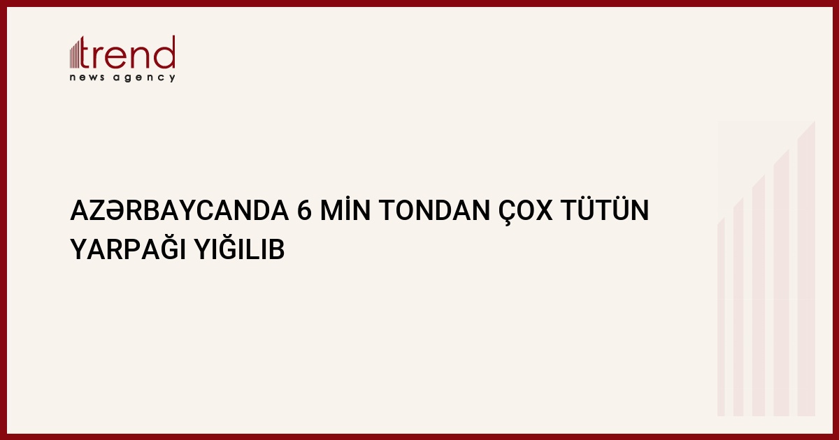 Oktyabrın 10-da verilən məlumata əsasən, Azərbaycanın regionlarında tütün yarpağı yığımı ilin əvvəlindən 6061 ton təşkil edib. Kənd təsərrüfatı nazirliyində Trend ə bildirilib ki, bu, 2004-cü ilin analoji dövrü ilə müqayisədə 680 ton çoxdur.