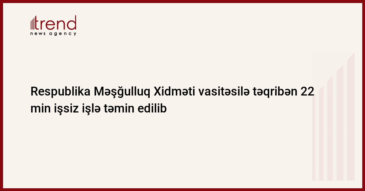 Bu ilin 10 ayı ərzində Respublika Məşğulluq Xidməti təqribən 22 min işsizi işlə təmin edib. İdarədən Trend ə verilən məlumata görə, ümumilikdə hər il məşğulluq xidməti orqanları 20-25 min adamı işlə təmin edir. Son dövrlər rəsmi qeydiyyatdan keçmiş işsizlərin sayında çox cüzi artım var. Belə ki, əvvəlki illərdən fərqli olaraq məşğulluq xidməti orqanlarına mürajiət edənlərin sayı da getdikcə çoxalır. Bunun əsas səbəbi isə 2003-cü ilin oktyabrından indiyədək ölkədə 300 mindən çox yeni iş yerinin yaradılmasıdır. Yaradılan bu yeni iş yerlərinin 150 mindən çoxu daimi iş yerləridir. Bu ilin noyabr ayına olan məlumata görə, Respublika Məşğulluq Xidmətində 56 min 423 nəfər işsiz kimi qeydiyyatdan keçib. Anjaq elə işsizlər var ki, məşğulluq xidmətinin mövcdluğu barədə xəbərsizdir. Ona görə də rəsmi rəqəmlər reallığı tam əks etdirmir.