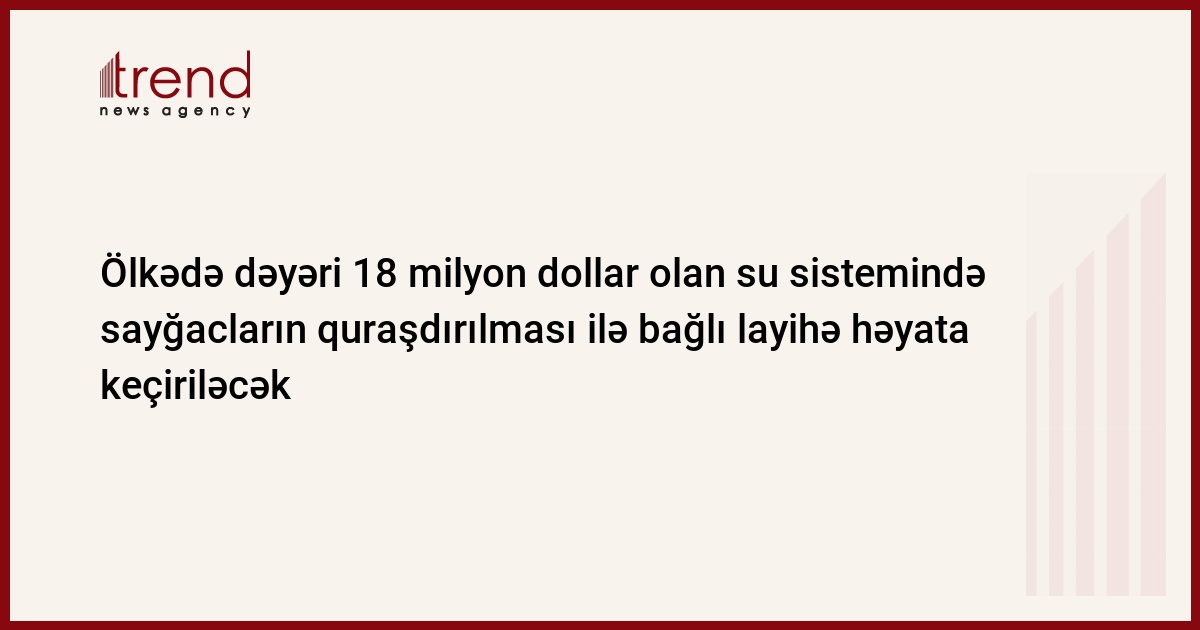 Dünya Bankı (DB) ölkədə həyata keçirəcəyi su sistemində sayğacların quraşdırılması ilə bağlı layihəyə 15 milyon dollar ayırmaq niyyətindədir. Bu barədə bankın Bakı nümayəndəliyindən Trend xəbər agentliyinə məlumat verilib. Verilən məlumata görə, hazırda sözügedən layihə hazırlanma mərhələsindədir. Ümumilikdə həyata keçiriləcək layihənin dəyəri təqribən 18 milyon dollar olacaq. Bunun 3 milyon dolları ölkə hökuməti tərəfindən ayrılacaq. Layihə ilə bağlı DB-nin su məsələləri üzrə missiyasının rəhbəri Bol Krisin gələn ilin əvvəlində Bakıya səfəri gözlənilir.