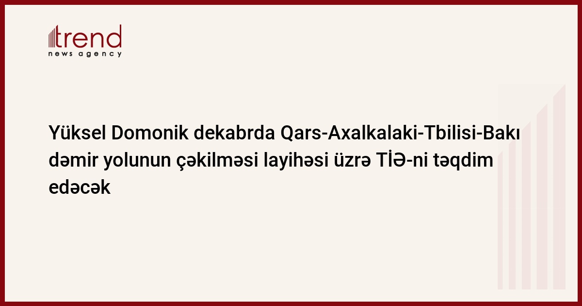 Qars-Axalkalaki-Tbilisi-Bakı dəmir yolunun çəkilməsi layihəsinin Türkiyənin Yüksel domonik şirkəti tərəfindən hazırlanan TİƏ-si dekabrın sonunda AR nəqliyat nazirliyinə təqdim ediləcək. Bu barədə Trend ə AR nəqliyyat nazirlyiində bildirilib.