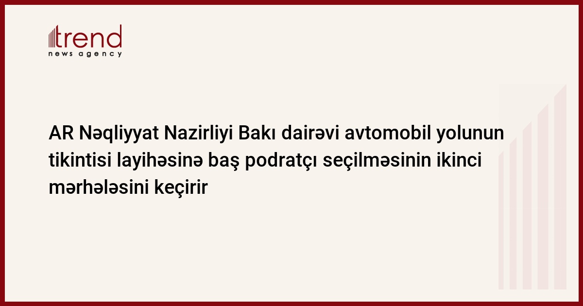 AR Nəqliyyat Nazirliyi Bakı dairəvi avtomobil yolunun tikintisi layihəsinə baş podratçı seçilməsinin ikinci mərhələsini keçirir. Bu barədə Trend ə nazirliyin Yolnəqliyyatservis Departamentində bildirilib. Layihənin baş podratçısı ilin sonunadək müəyyən edilə bilər, tikinti işlərinə isə 2006-cı ilin ortalarında başlanıla bilər.
