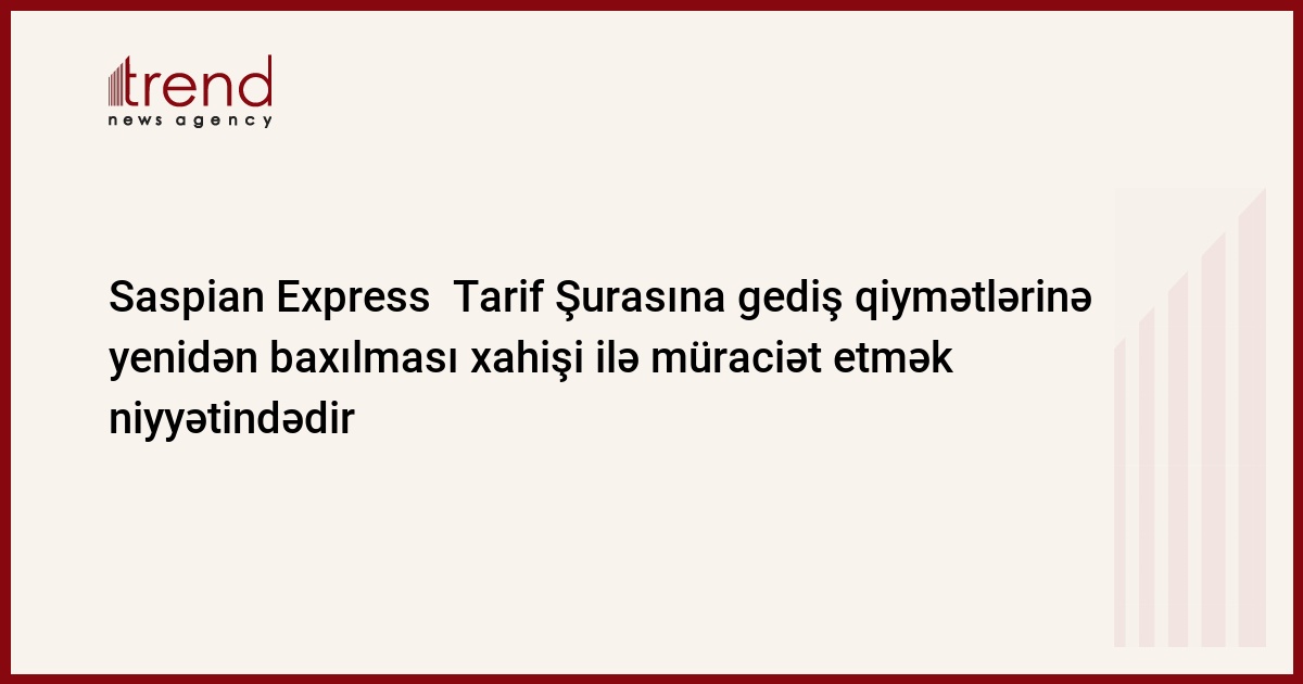 Azərbaycanın özəl nəqliyyat şirkəti Saspian Express Tarif Şurasına gediş qiymətlərinə yenidən baxılması imkanları barədə xahişlə mürapciət etmək niyyətindədir. Bu barədə Trend ə Saspian Express-in baş direktoru Fəxri Ağayev məlumat verib.