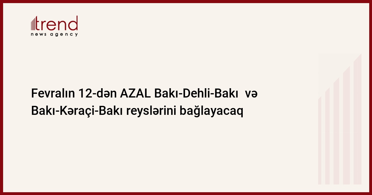 Fevralın 12-dən AZAL aviasiya şirkəti Bakı-Dehli-Bakı və Bakı-Kəraçi-Bakı marşrutları üzrə uçuşların həyata keçirilməsini dayandırır. Bu, həmin istiqamətlərdə uçuşların məqsədəuyğun olmaması ilə izah edilir. Bu barədə Trend ə AZAL Dövlət Konsernindən məlumat verilib.