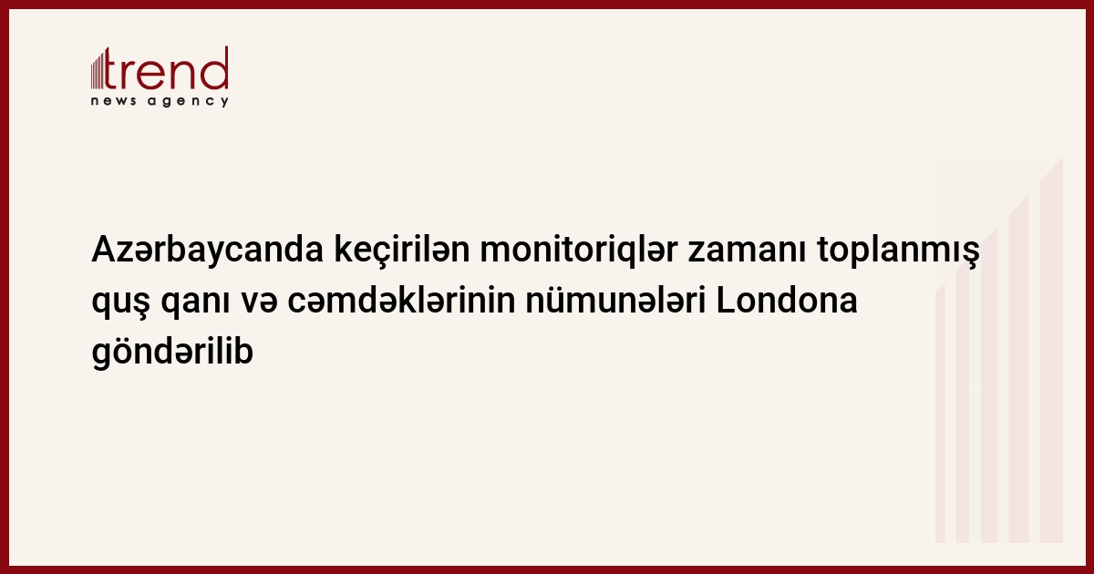 Azərbaycandakı monitorinqlərin gedişində toplanmış quş qanı və cəmdəklərinin nümunələri "quş qripi" virusunun müəyyən edilməsi üçün ABŞ-ın Bakıdakı səfirliyinin təşəbbüsü ilə təkrar analiz üçün Londona göndərilib. Bu barədə Trend ə Kənd Təsərrüfatı Nazirliyindən məlumat verilib.