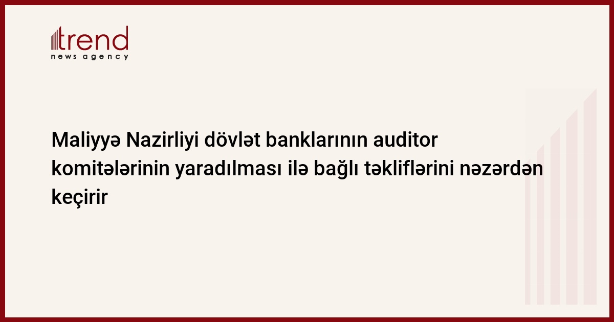 Maliyyə Nazirliyi Azərbaycan Beynəlxalq bankında və Kapitalbankda bu dövlət banklarının vəziyyəti ilə bağlı hesabatlar verilməsi məqsədilə auditor komitələrinin yaradılmasında maraqlıdır. Maliyyə naziri Əvəz Ələkbərov Trend ə bildirib ki, bu banklar nazirliyə komitələrin tərkibi ilə bağlı təkliflər təqdim edib.