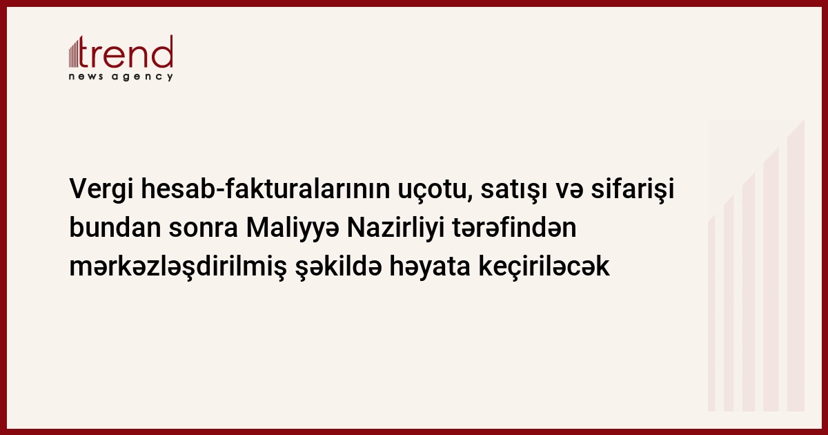 Nazirlər Kabineti Azərbaycan Respublikasında tətbiq olunan vergi hesab-fakturalarının mərkəzləşdirilmiş qaydada uçotu, satışı və sifarişinin tətbiqi barədə Qaydaları tətbiq edib. Hökumətdən Trend ə verilən məlumata görə, bu funksiyaların təsdiqlənmiş forma və rekvizitlərə müvafiq həyata keçirilməsi Maliyyə Nazirliyinə həvalə olunub. Maliyə Nazirliyi tərəfindən sifariş edilən mərkəzləşdirilmiş qaydada hesab-fakturalar vergi ödəyüiciləri tərəfindən 2006-cı il iyulun 1-dən tətbiq ediləcək. Həm də bu zaman vergi hesab-fakturaların hazırlanması zamanı əvvəllər istifadə olunmuş seriyaların təkrar olunmamasına diqqət veriləcək.