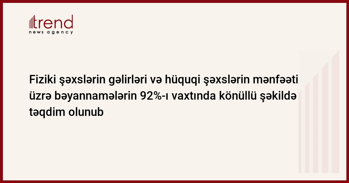 Martın 31-nə olan vəziyyətə görə, 17,280 vergi ödəyicisi fiziki şəxslərin gəlir vergisi və hüquqi şəxslərin mənfəət vergisi üzrə bəyannamə təqdim edib. Trend agentliyinin Vergilər Nazirliyinin İqtisadi Təhlil və Uçotun İdarəolunması İdarəsinin rəisi Zaur Fətizadəyə istinadən yaydığı məlumata əsasən, ötən ilin göstəricisindən 3,2% artıqdır.