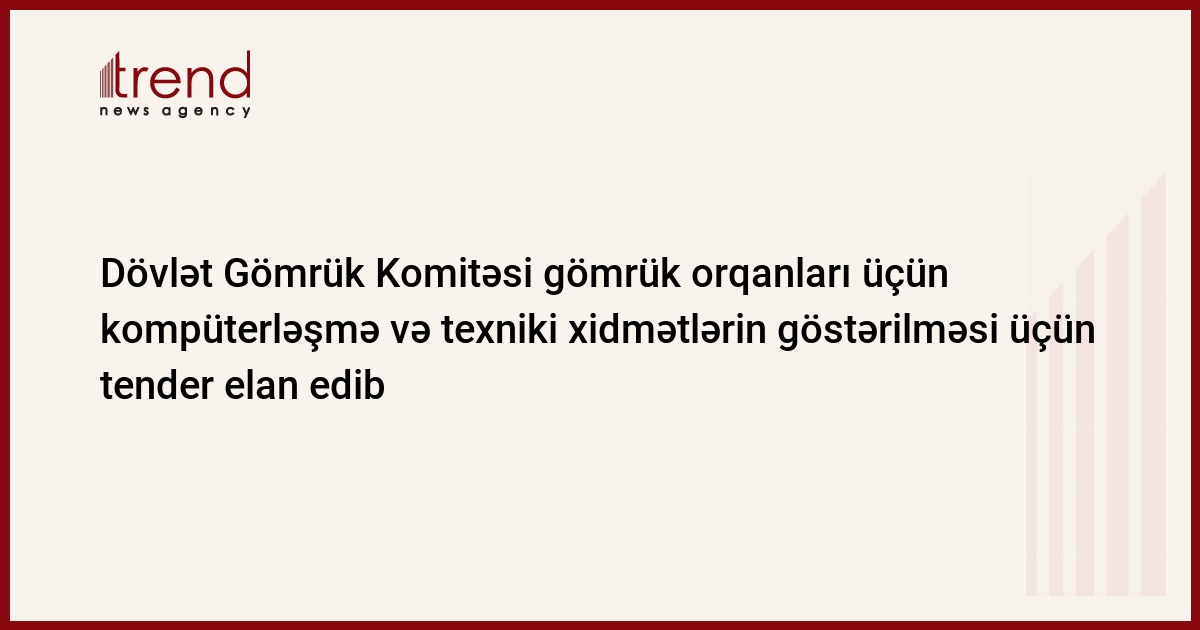 Dövlət Gömrük Komitəsi (DGK) kompüterləşdirmə və texniki xidmətlərin göstərilməsi üzrə tender elan edib. Trend in verdiyi məlumata görə, tenderin predmeti komitənin aparatının özündə və ona tabe olan gömrük orqanlarında problemlərin həllinə aid tapşırıqların kompüterləşdirilməsi, ofis texnikasının quraşdırılması, DGK-nin saytı üzrə xidmətlər, nəzarət və texniki xidmətlərin göstərilməsi üzrə avadanlıqların alınmasından ibarətdir.