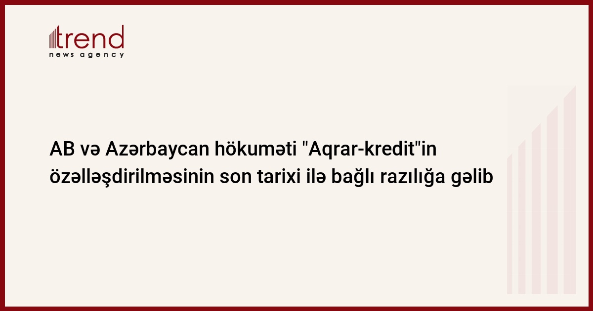 AB-nin 190 min avro dəyərində və yarım il üçün nəzərdə tutulmuş əvvəlki layihəsi 2006-cı il aprelin 20-də başa çatıb. "AB və Azərbaycan hökuməti arasında qarşılıqlı anlaşma haqqında protokola əsasən, "Aqrar-kredit"in son özəlləşdirilmə tarixi 2008-ci ilin sonuna təyin edilib", - deyə Y.Vəliyev nəzərə çatdırıb.