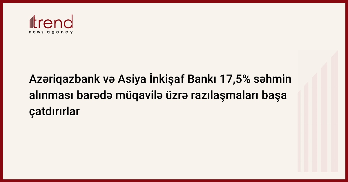 Azəriqazbank və Asiya İnkişaf Bankı (AİB) Azərbaycan bankının səhmlərinin alınması barədə müqavilə üzrə razılaşmaları başa çatdırırlar. Azəriqazbankın idarə heyətinin sədri Azər Mövsümovun Trend ə verdiyi xəbərə görə, iyulda Azəriqazbank, AİB və Beynəlxalq maliyyə korporasiyası arasında üçtərəfli müqavilənin imzalanması nəzərdə tutulur. AİB və BMK 17,5% səhm alırlar.