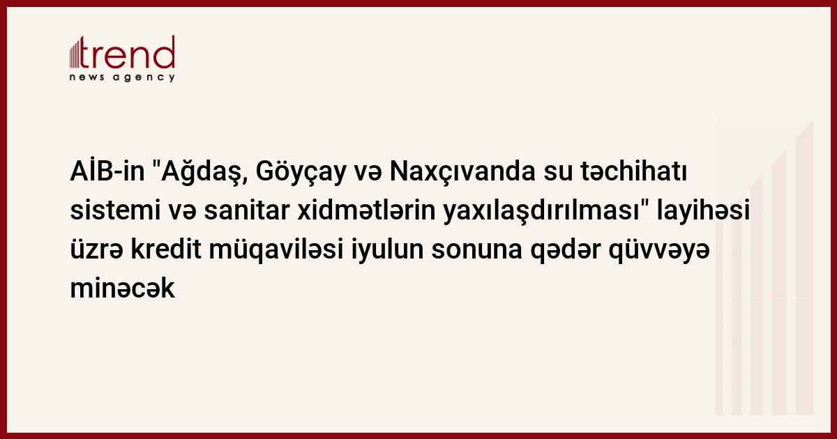 İyulun sonuna qədər Azərbaycan hökumətilə Asiya İnkişaf Bankı arasında "Ağdaş, Göyçay və Naxçıvanda su təchihatı sistemi və sanitar xidmətlərin yaxılaşdırılması" layihəsi üzrə kredit müqaviləsi iyulun sonuna qədər qüvvəyə minəcək. Bu barədə Trend ə bankın Bakı nümayəndəliyindən xəbər veriblər. AİB-ıin baş mütəxəssisi Şakil Xanın rəhbərlik etdiyi missiya layihənin başlanması prosesilə tanış olamaq üçün həftə sonuna qədər Bakıda qalacaq.