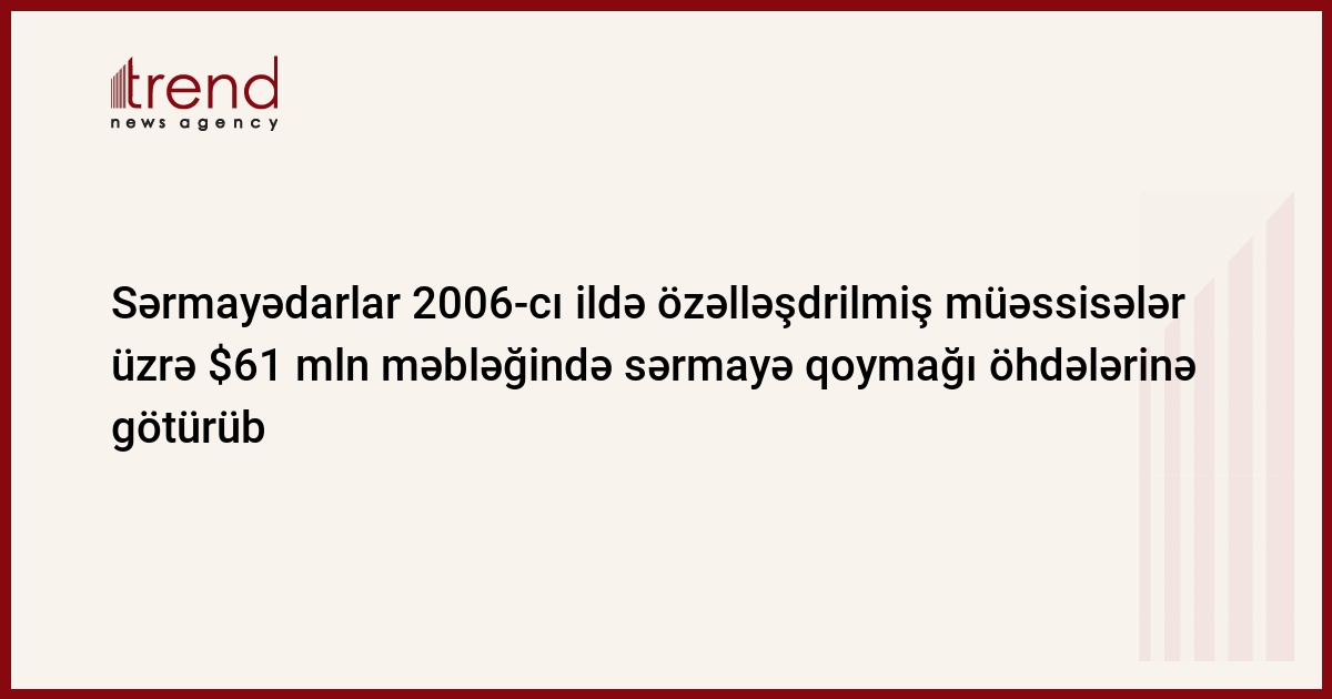 Məlumatda o da deyilir ki, sərmayədarlar tərəfindən özəlləşdirilmiş müəssisələr üzrə götürülmüş müqavilə öhdəliklərinin yerinə yetirilməsinin monitorinqi davam etdirilir.