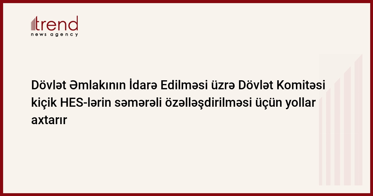 Dövlət Əmlakının İdarə Edilməsi üzrə Dövlət Komitəsi dövlətin balansında qalmış 9 kiçik hidro elektrik stansiyasından 6-sının səmərəli özəlləşdirilməsi üçün tədbirləri davam etdirir. Bu barədə Trend ə Dövlət Komitəsindən xəbər veriblər.