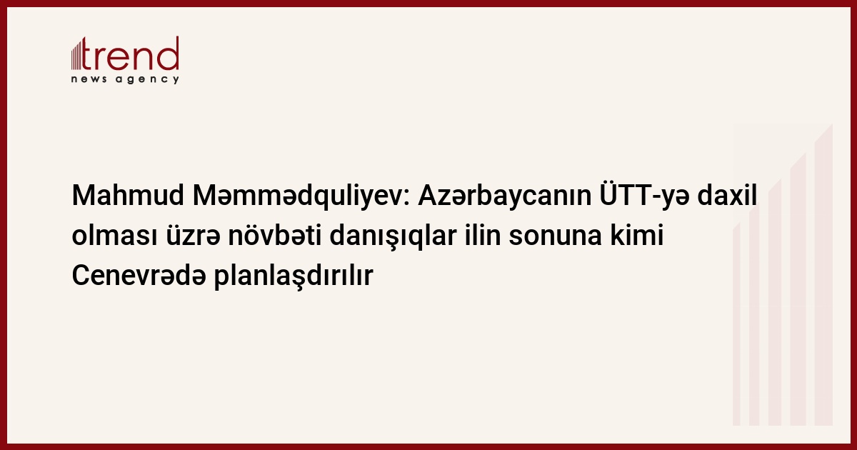 Azərbaycanın Ümumdünya Ticarət Təşkilatına (ÜTT) daxil olması üzrə növbəti danışıqların bu ilin sonuna kimi Cenevrədə keçirilməsi planlaşdırılır. Bu barədə Trend ə Azərbaycanın xarici işlər nazirinin müavini Mahmud Məmmədquliyev məlumat verib.