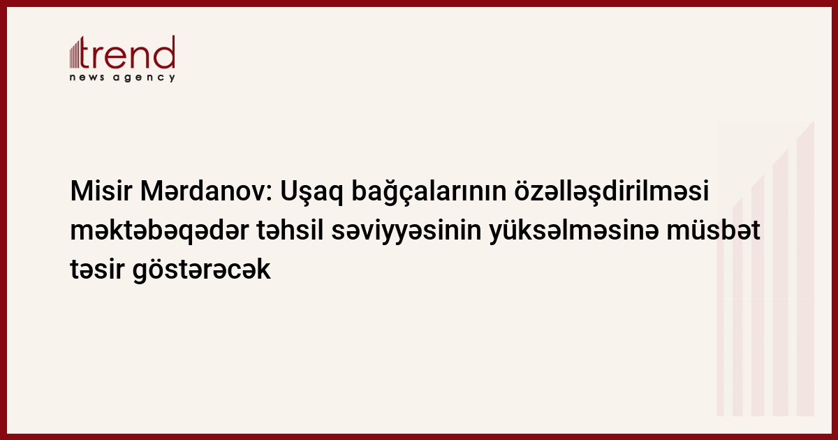 Uşaq bağçalarının özəlləşdirilməsi Azərbaycanda məktəbəqədər təhsil səviyyəsinin yüksəlməsinə müsbət təsir göstərəcək. Trend in xəbər verdiyi kimi, bu barədə jurnalistlərə Azərbaycanın təhsil naziri Misir Mərdanov bildirib.