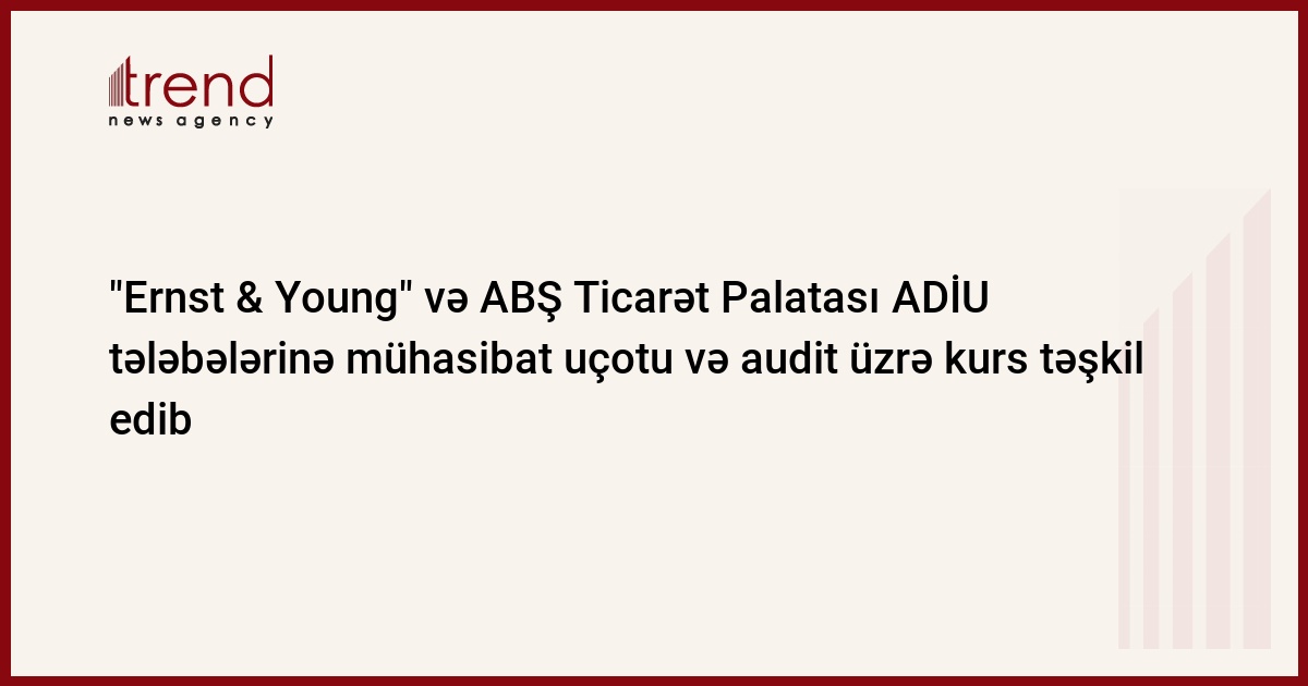 "Ernst & Young" şirkətinin Bakı ofisi, Azərbaycanda ABŞ Ticarət Palatası və Azərbaycan Dövlət İqtisad Universiteti (ADİU) ADİU-da yeni təhsil proqramının dəstəklənməsi üçün əməkdaşlıq ediblər. Trend in "Ernst & Young"ın məlumatına istinadən xəbər verdiyi kimi, ABŞ Ticarət Palatasının maliyyə dəstəyi ilə "Ernst & Young" universitetin Xüsusi İstedadlar Qrupunun 4-cü kurs tələbələrinə mühasibat uçotu üzrə aralıq kurs təşkil edib.