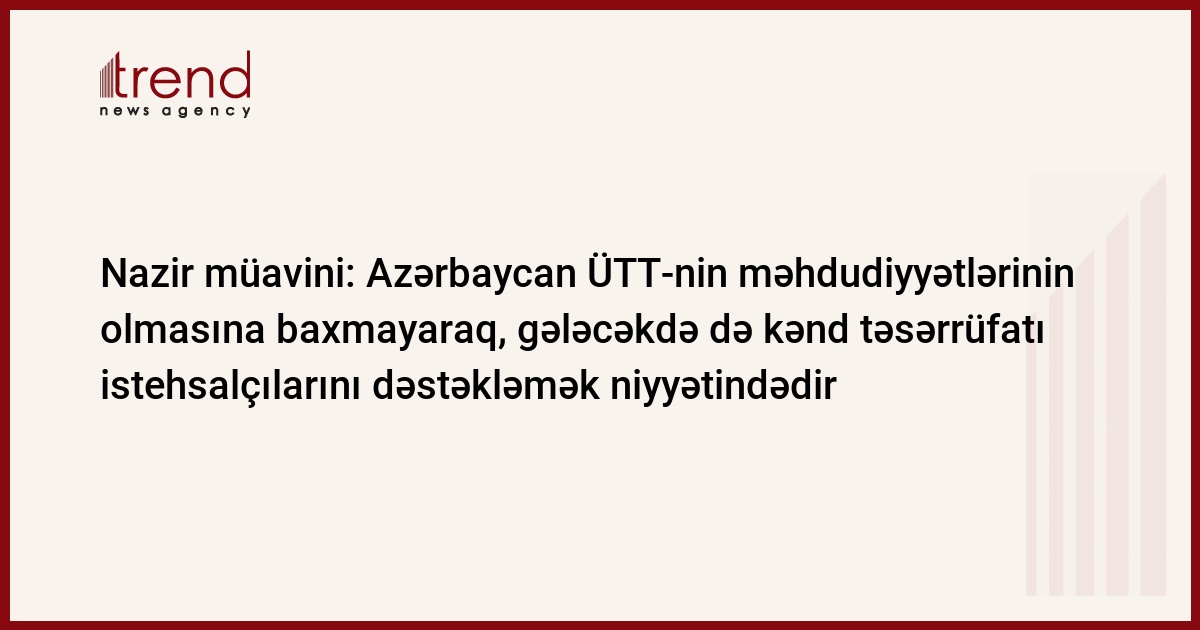"Ümumdünya Ticarət Təşkilatı (ÜTT) Azərbaycanın kənd təsərrüfatı istehsalçıları üçün vergi güzəştlərinin aradan qaldırılmasına təkid edir. Yardımın göstərilməsi zamanı kənd təsərrüfatı mallarının qiymətinin formalaşmasına təsir göstərən istiqamətlərdə daxili dəstəyə ÜTT məhdudiyyətlər qoyur. Hesab edilir ki, bu cür dəstək sektorun və ticarətin nizamlanmasına mənfi təsir göstərir", - deyə xarici işlər nazirinin müavini Mahmud Məmmədquliyev Trend ə məlumat verib.