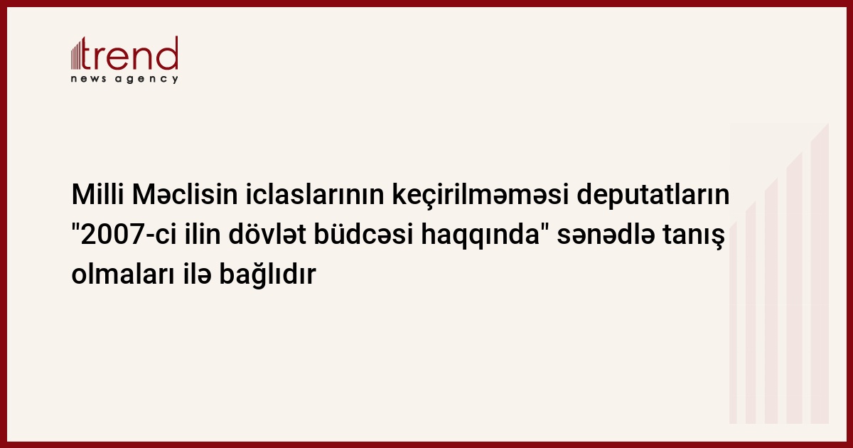 Milli Məclisin növbəti iclaslarının keçirilməməsi millət vəkillərinin "2007-ci ilin dövlət büdcəsi haqqında" qanun layihəsi ilə tanış olmaları ilə bağlıdır. Bu barədə Trend ə Milli Məclisin müdafiə və təhlükəsizlik məsələləri daimi komissiyası sədrinin müavini Aydın Mirzədadə parlamentin iclaslarının oktyabrın 20-dən sonra keçirilməməsi ilə bağlı mətbuatda yazılanlara münasibət bildirərkən qeyd edib.